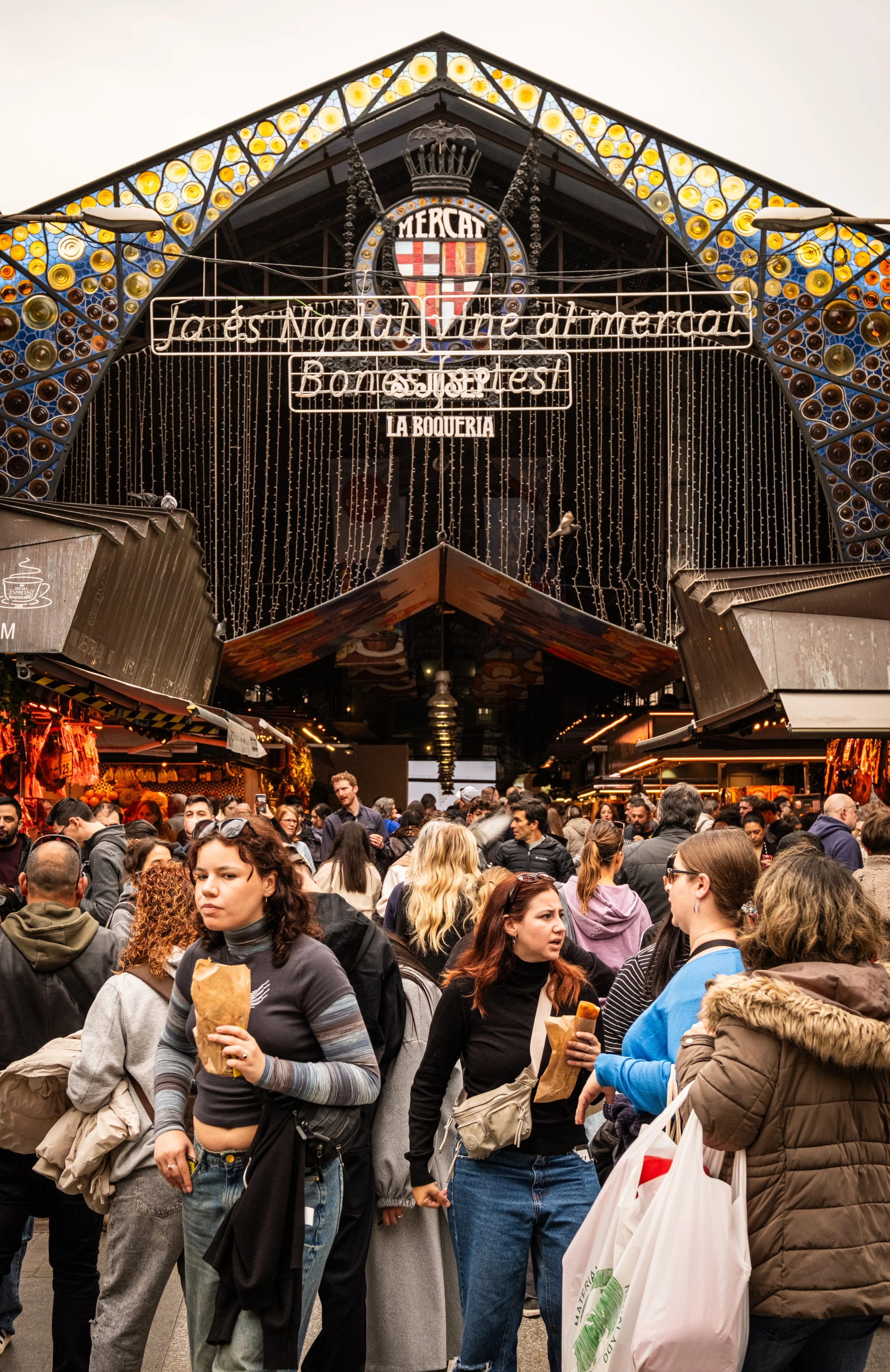 Markets are woven into daily life in Barcelona — places where locals pick up fresh produce, exchange quick words with vendors, and move with practiced ease between counters. You’ll find them in nearly every neighborhood, each with its own rhythm and regulars. La Boqueria is by far the most popular — some might say overrated. Locals often call it overpriced, too crowded, too many tourists. And yet, it’s hard to deny the draw: the sheer sensory overload, the hanging jamón, the rainbow of fruit juices, the echo of knives and footsteps under the iron roof. It may not be the most authentic, but it’s very much part of the city’s stage — loud, vibrant, unapologetically on display.