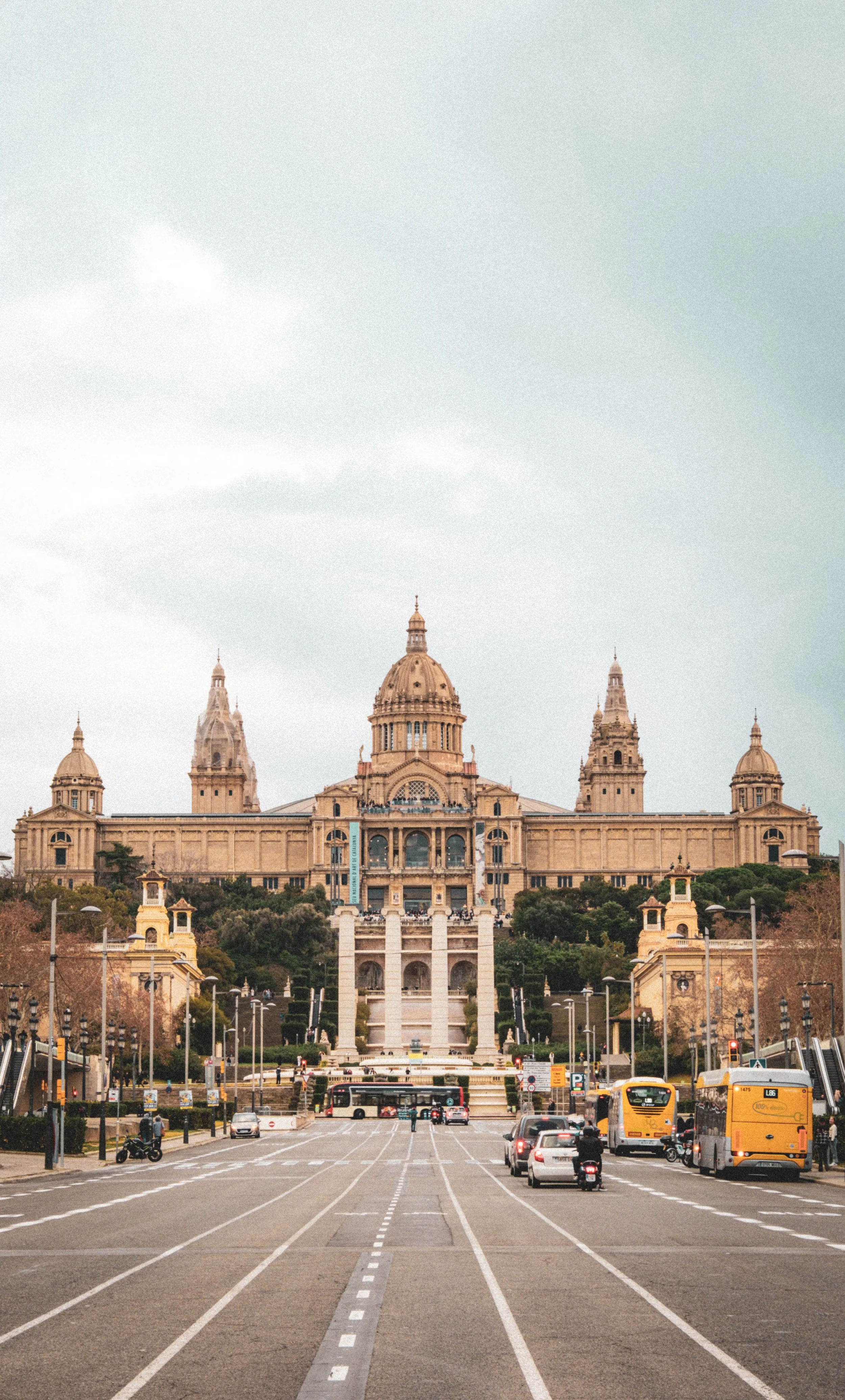 Museu Nacional d’Art de Catalunya (MNAC), viewed from the boulevard Avinguda de la Reina Maria Cristina on an overcast day