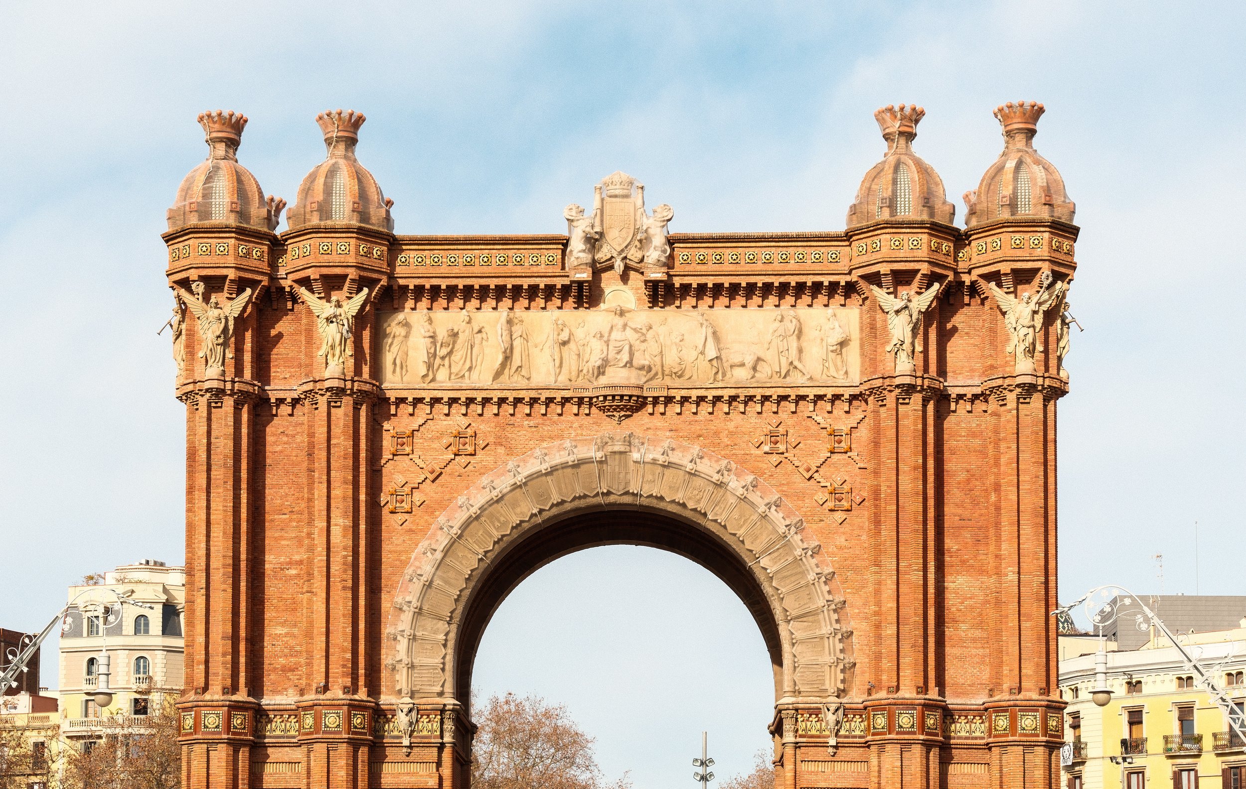 The Arc de Triomf stands at the top of Passeig de Lluís Companys in Barcelona. Built from red brick with detailed stonework, it forms a wide passageway framed by palm trees and streetlights. The walkway beneath it is busy with people walking, cycling, and skating, while the open space around the arch gives a clear view of the sky and the nearby park.