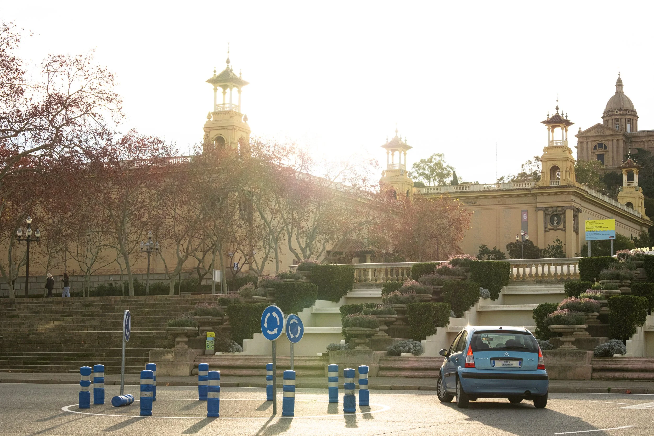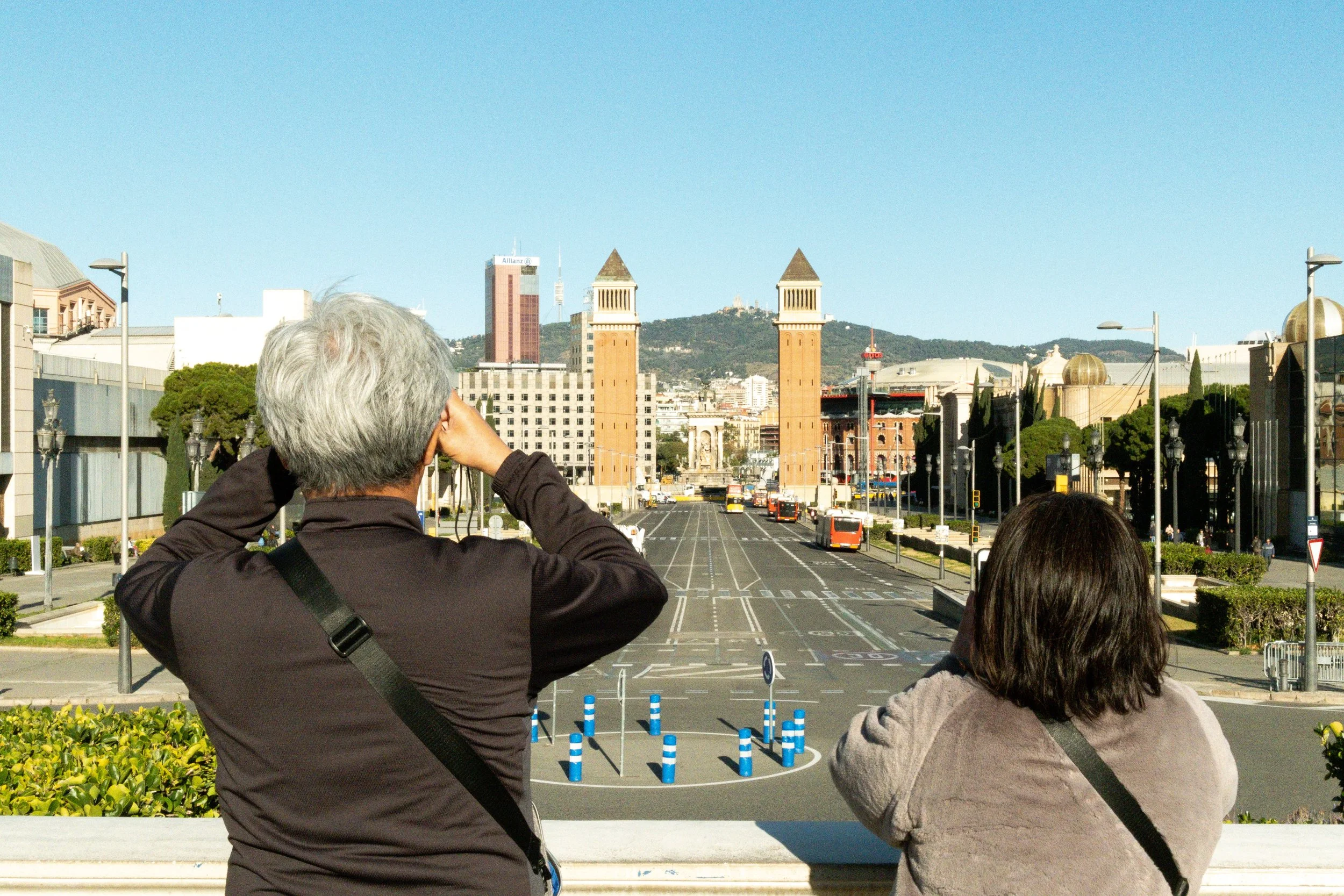 Looking up Avinguda de la Reina Maria Cristina toward the Venetian Towers and Plaça d'Espanya.