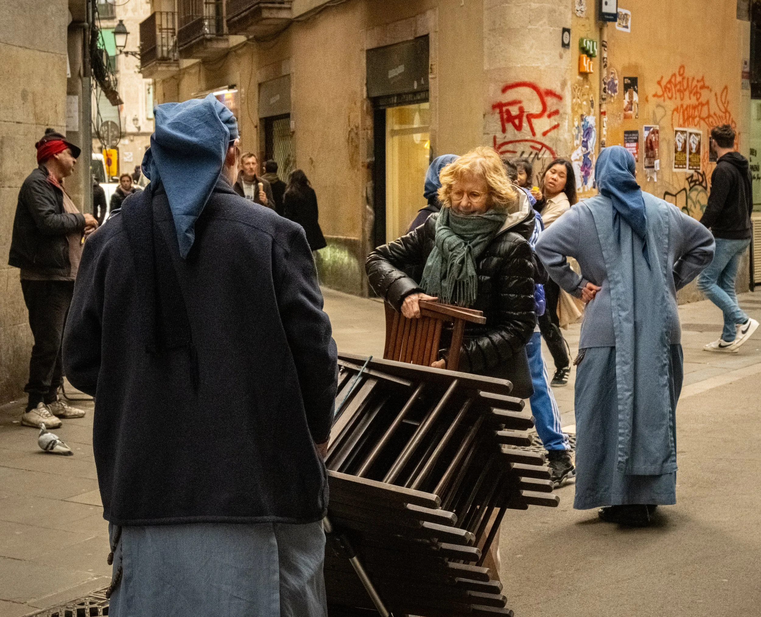 It’s not a city that announces itself all at once. A nun wheels a cart of folding chairs through a narrow street streaked with graffiti, while someone lights a cigarette two steps away, uninterested. A man in a long coat plays a wooden flute beneath a carved window, his melody swallowed by footsteps and fading light. In another square, a saxophonist leans into a solo with no audience but the stone. A guitarist walks alone with his case slung across his back, vanishing into an alley that smells like coffee and wet stone. Some alleys are packed shoulder to shoulder; others give you room to breathe.
